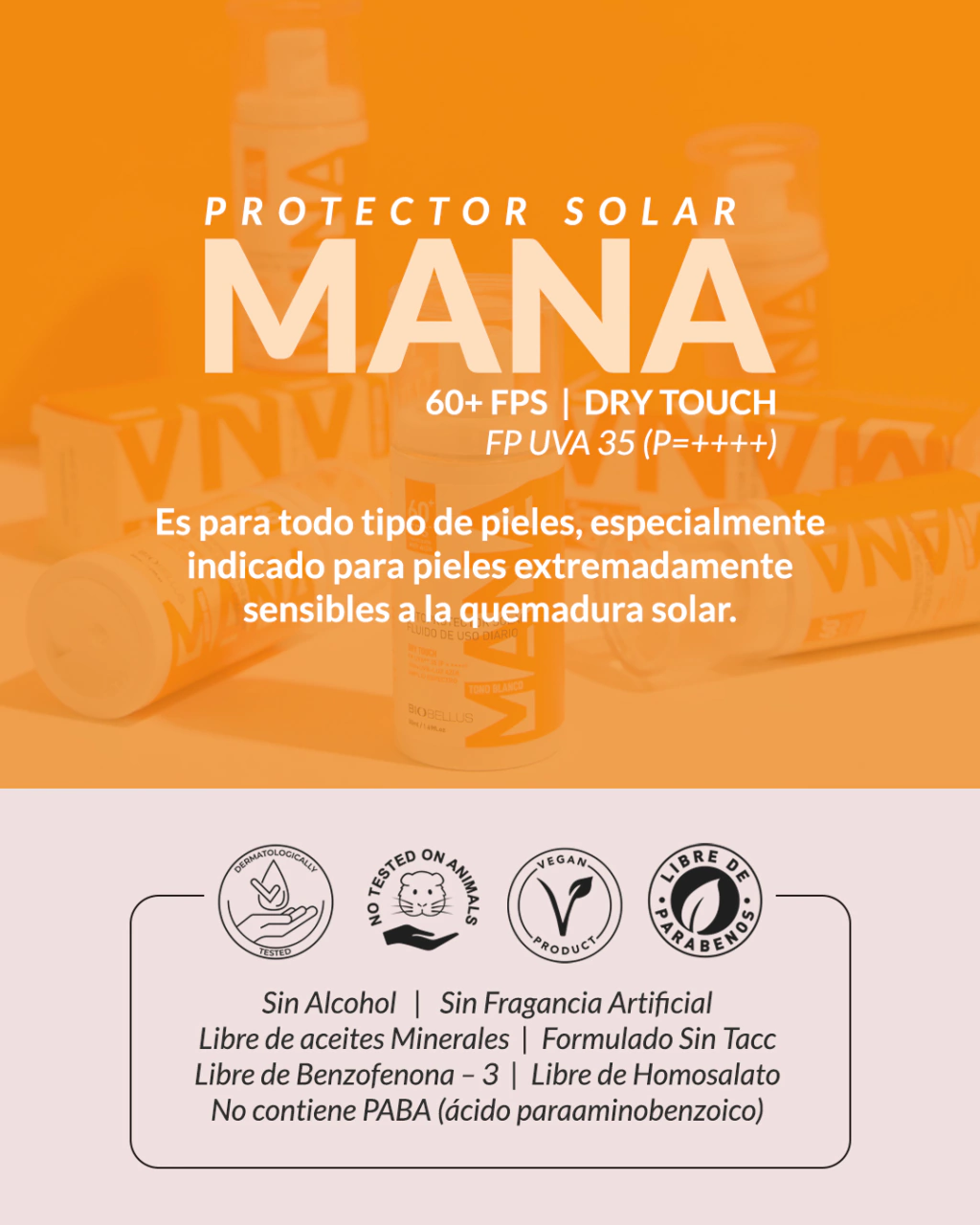 ¡NUEVO! MANA Protector solar 60+ FPS* - FP UVA** 35 (P = ++++) | Tono Blanco | 50 ml